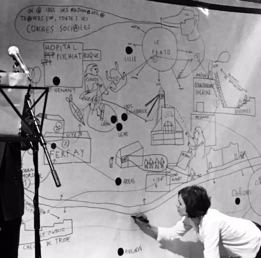 « Pour parler de ma pratique d’artiste plasticienne dans l’école où j’enseigne, j’aimerais pouvoir prendre le temps de rassembler quelques expériences qui ont compté pour moi, en les mettant en perspective. Longtemps, j’ai pratiqué sans atelier. J’aimerais évoquer mes façons d’aller dans le monde pour collecter des histoires, pour les traduire (par la cartographie sensible, par la performance dessinée, par les mots écrits ou parlés) et pour les redonner à entendre et à voir.