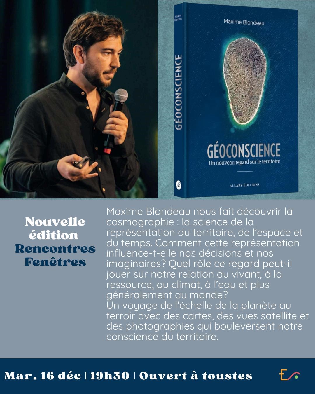 Maxime Blondeau nous fait découvrir la cosmographie : la science de la représentation du territoire, de l’espace et du temps. Comment cette représentation influence-t-elle nos décisions et nos imaginaires ? Quel rôle ce regard peut-il jouer sur notre relation au vivant, à la ressource, au climat, à l’eau et plus généralement au monde ?