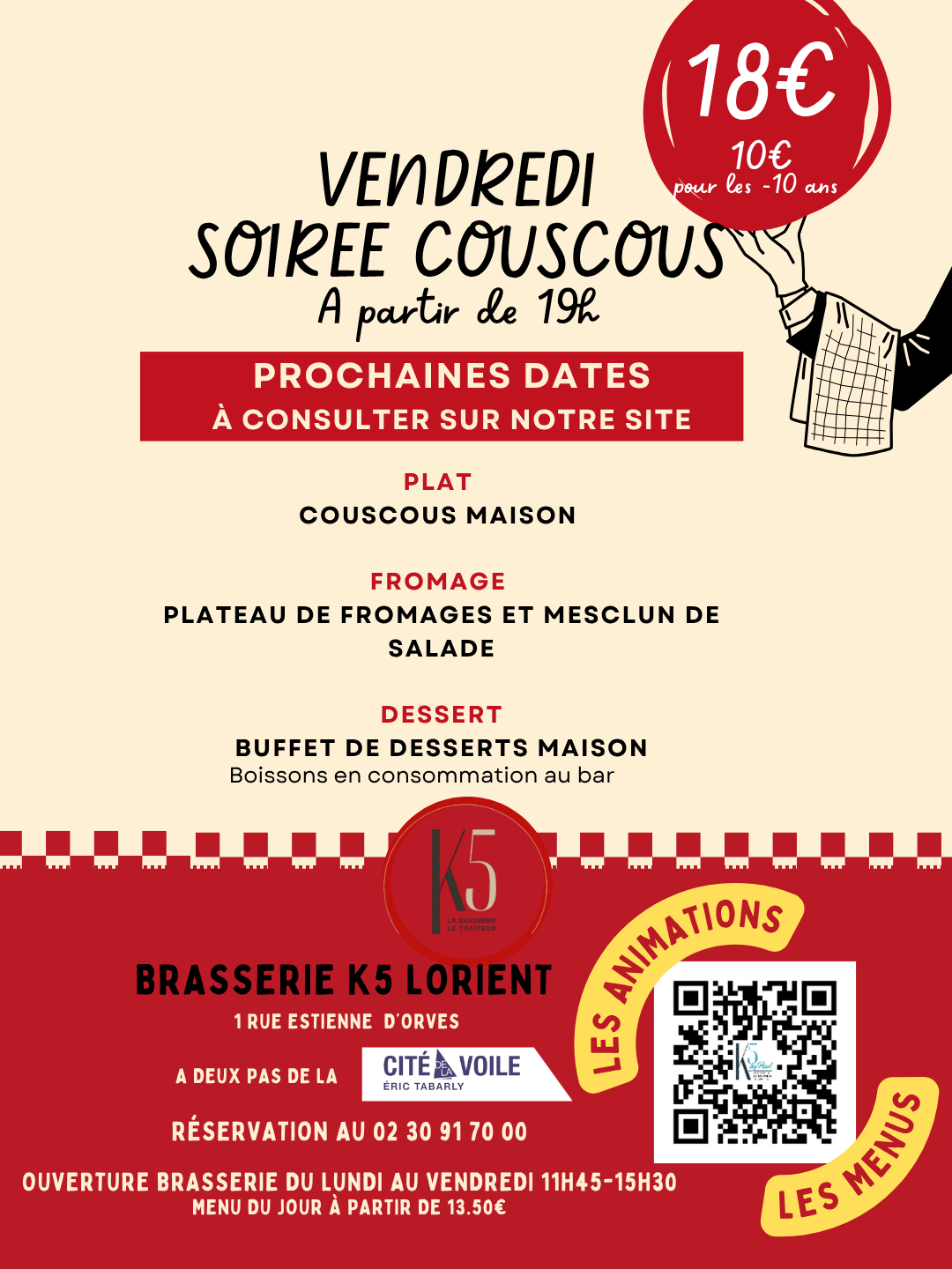 Repas au restaurant avec service en buffet, profitez de notre couscous maison, plateaux de fromages et dessert au choix pour seulement 18 €/ repas ! Boissons à la carte et possibilité de danser sur notre playlist selon l’ambiance de la salle …
