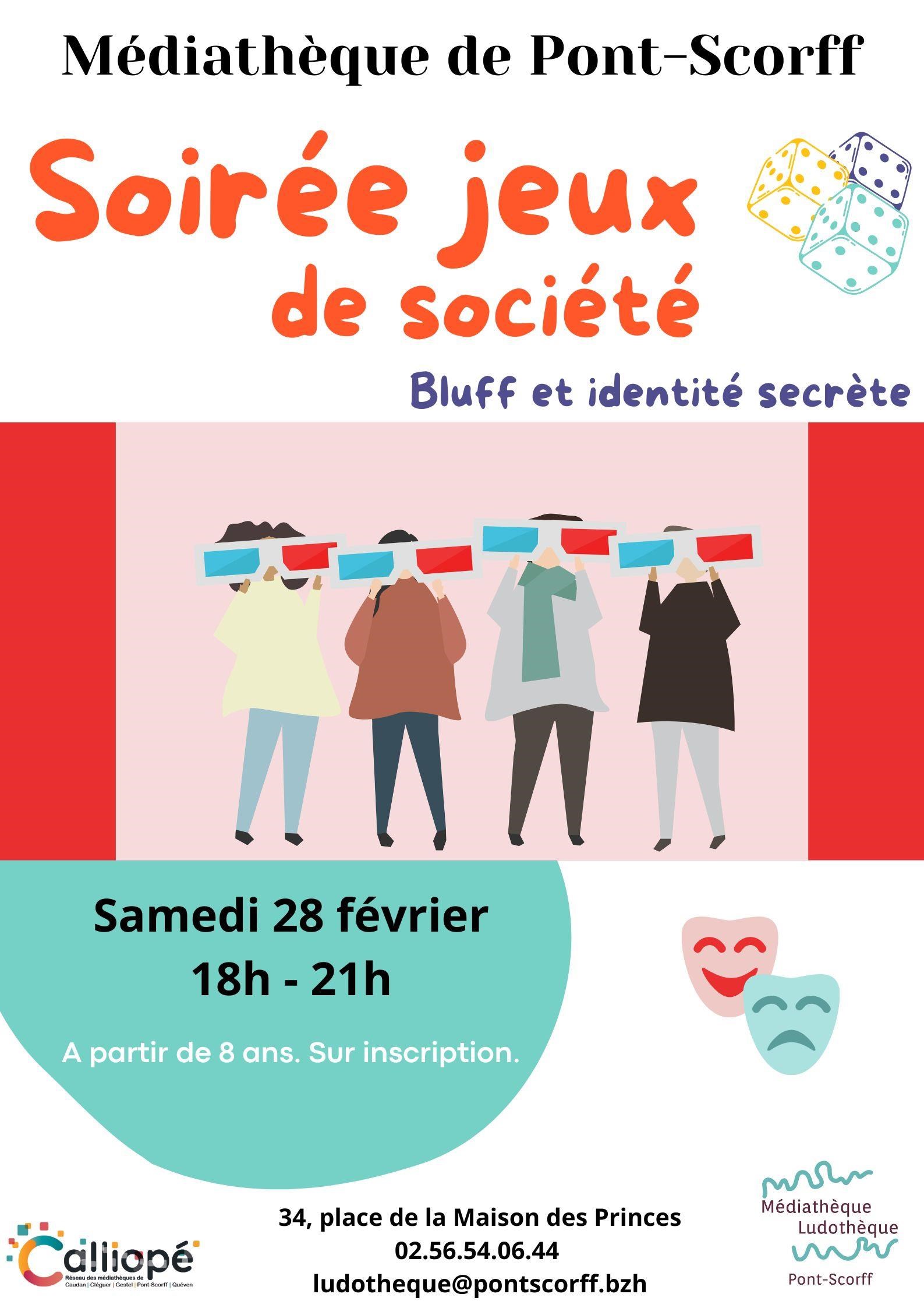 Jeux de société. Une soirée qui mettra à l’honneur les jeux de la ludothèque dont la victoire repose sur la capacité du joueur à tromper son adversaire (Le saboteur, Traîtres à bord, Pigeon Pigeon, etc.). À partir de 8 ans, sur inscription. Samedi 28 février de 18 h à 21 h, médiathèque ludothèque, 34, place de la Maison-des-Princes, Pont-Scorff. Gratuit. Contact : 02 56 54 06 44, ludotheque@pontscorff.bzh, https://calliope.bzh/.
