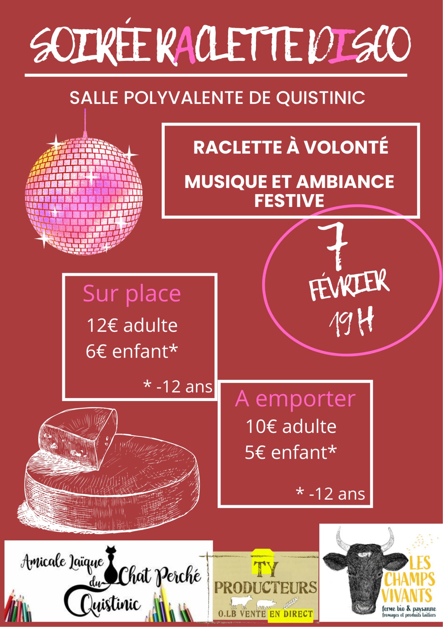 L’Amicale Laïque de l’école Le Chat Perché à Quistinic organise une soirée Raclette Disco le samedi 7 février (19h-00h) à la salle polyvalente de Quistinic.