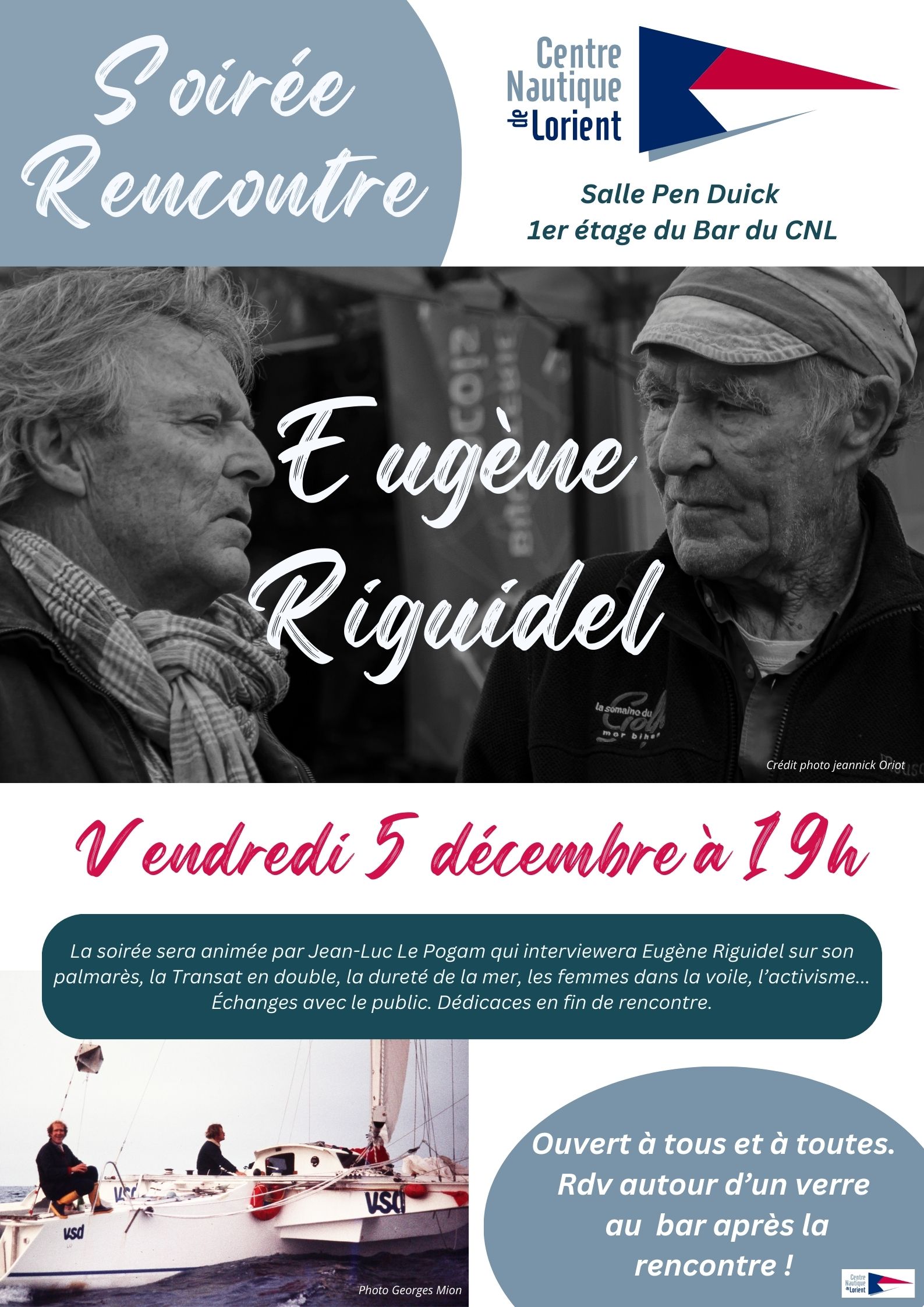 La soirée sera animée par Jean-Luc Le Pogam qui interviewera Eugène Riguidel sur son palmarès, la Transat en double, la dureté de la mer, les femmes dans la voile, l’activisme… Échanges avec le public. Dédicaces en fin de rencontre.