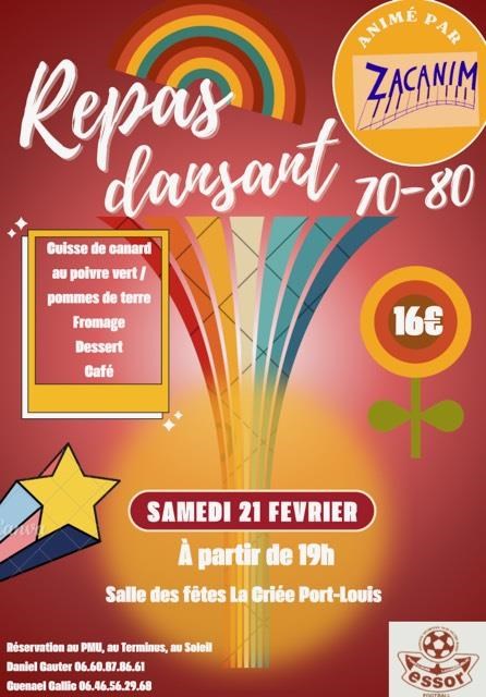 Soirée dansante 70-80 animée par Aacanim, organisée par l’Entente sportive sud outre-rade. Tarif repas 16 €. Repas cuisse de canard au poivre vert, fromage, dessert, café. Ticket en vente PMU-Terminus-Au soleil à Port-Louis.