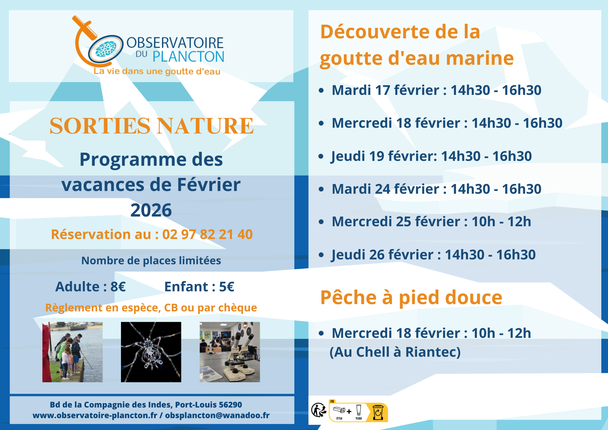 Venez découvrir pendant les vacances nos différentes activités, mêlant la pêche et l’observation du plancton d’eau douce ou d’eau marine. Que ce soit en famille ou entre amis, un spécialiste vous accompagne et répond à vos questions sur le monde aquatique, en particulier sur le monde planctonique.