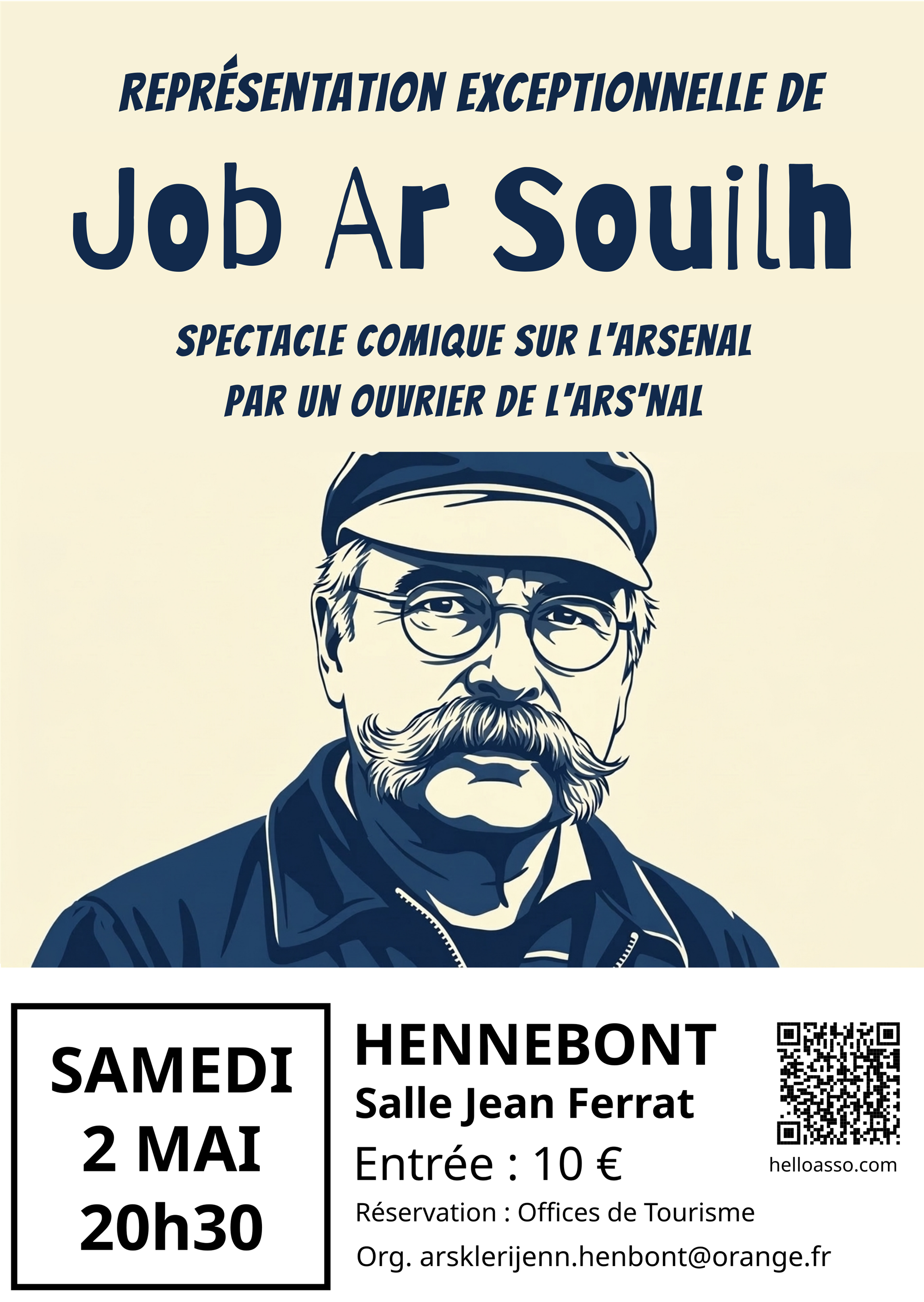 Job Ar Souilh ou le seul-en-scène d’un ancien ouvrier de l’arsenal de Lanester qui nous présentera ses anecdotes et son regard ethno-industriel sur cette ville dans la ville, ce microcosme si particulier ou comme il préfère le dire son « étude socio prolo éthylo comik ». Un spectacle qui parle de la culture populaire ouvrière du Pays de Lorient avec énormémentd’humour et d’autodérision !