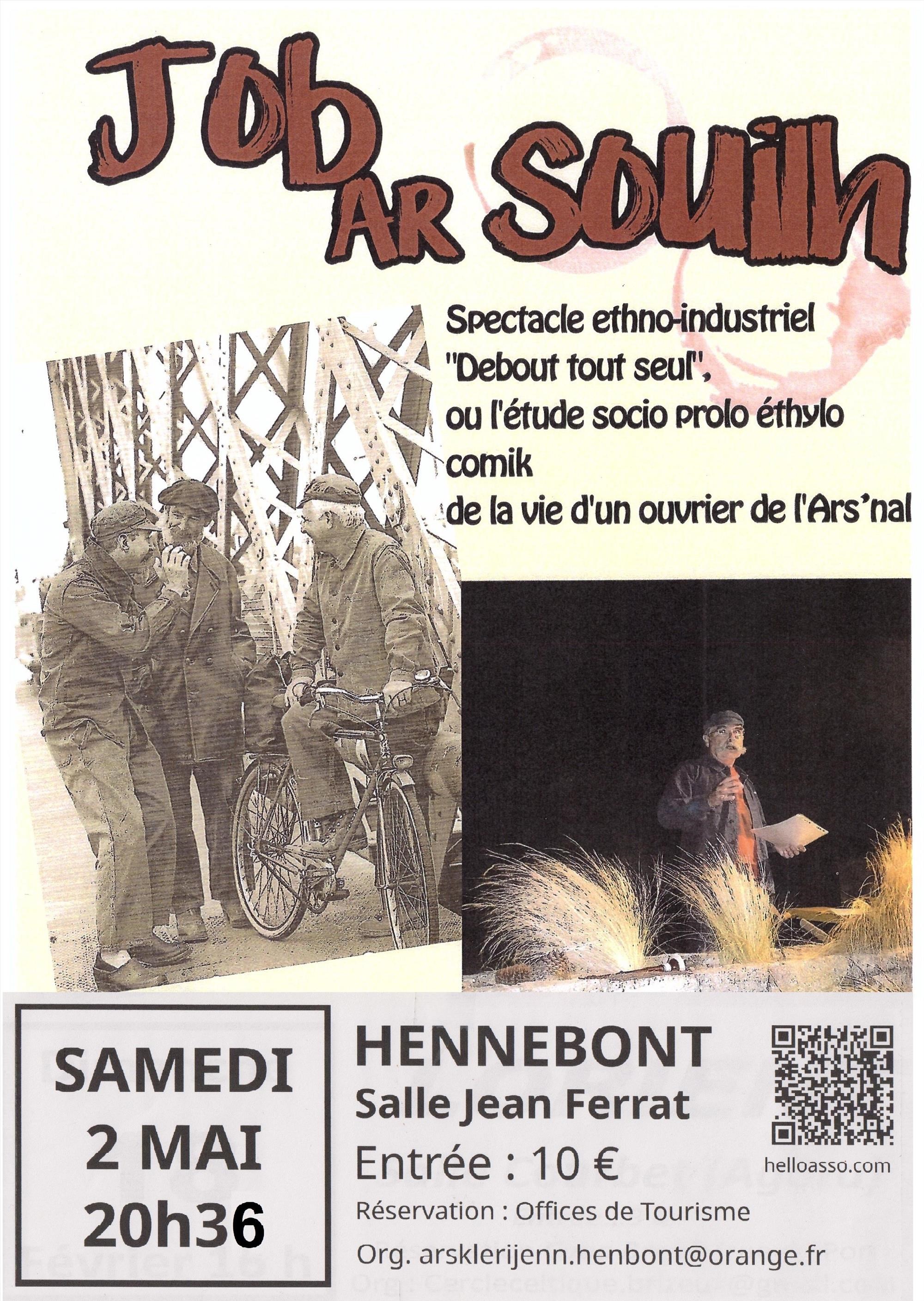 A Hennebont le samedi 2 mai à 8 h 36 en soutien au projet d’école Diwan, Un spectacle « Debout Tout Seul » Socio-Prolo-Ethylo-Comik. L’histoire, à dormir debout, du plus grand vivier de la côte de Bretagne sud, par un trouveur de légende Ethno-Industrielle. Il est difficile de faire la part entre la légende et la réalité quand il parle de » la grande maison ». Job a raconté la vie des « cocus du port » derrière le mur de l’Ars’nal. Réservation Offices du Tourisme du pays de Lorient.