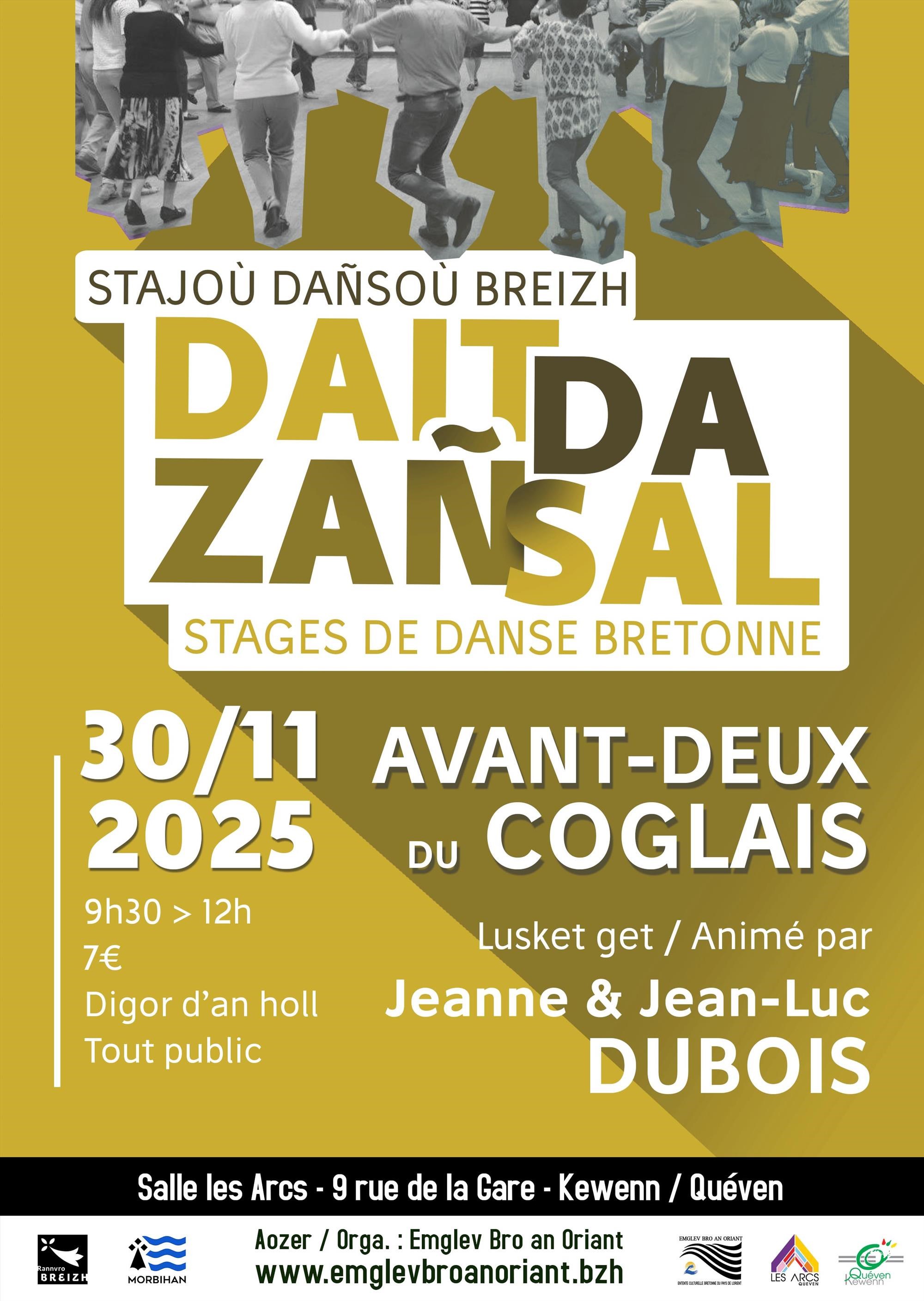 Emglev Bro an Oriant vous invite à un atelier de danse Dait da Zañsal animé par les référents Jeanne et Jean-Luc Dubois, pour découvrir l’avant-deux du Coglais !