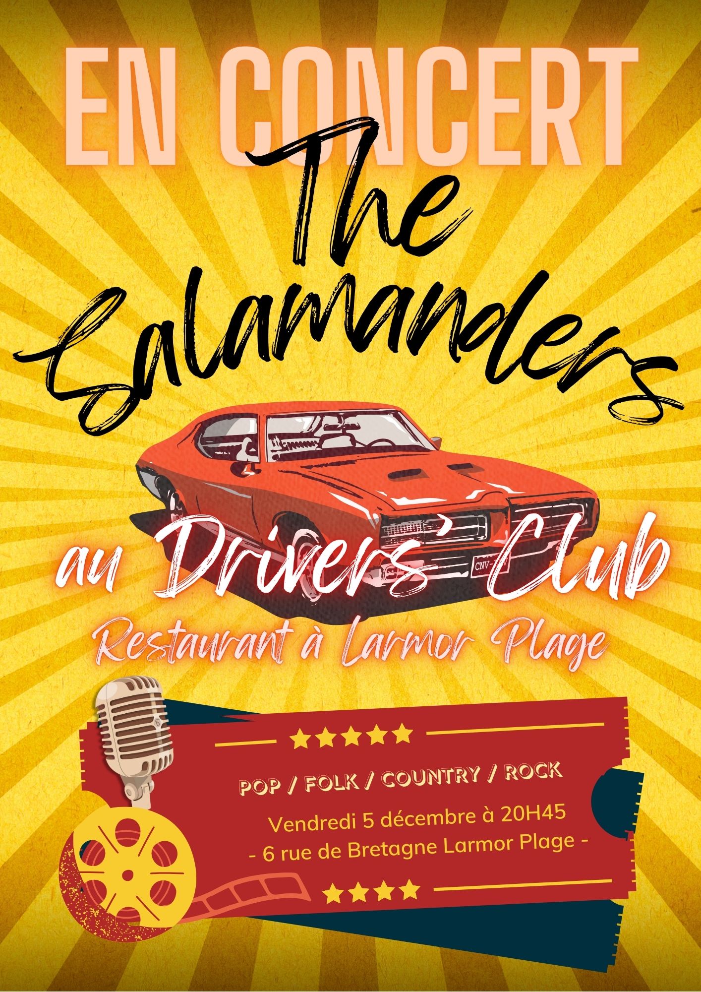 The Salamanders, c’est un groupe de covers de chansons américaines issues des meilleurs films. Le groupe est composé de 8 membres dont 4 chanteuses et un chanteur ! Nous serons en concert vendredi 5 décembre 2025 à 20h45 à Larmor Plage au Drivers Club. Entrée libre. Conso au bar. Venez nombreux !