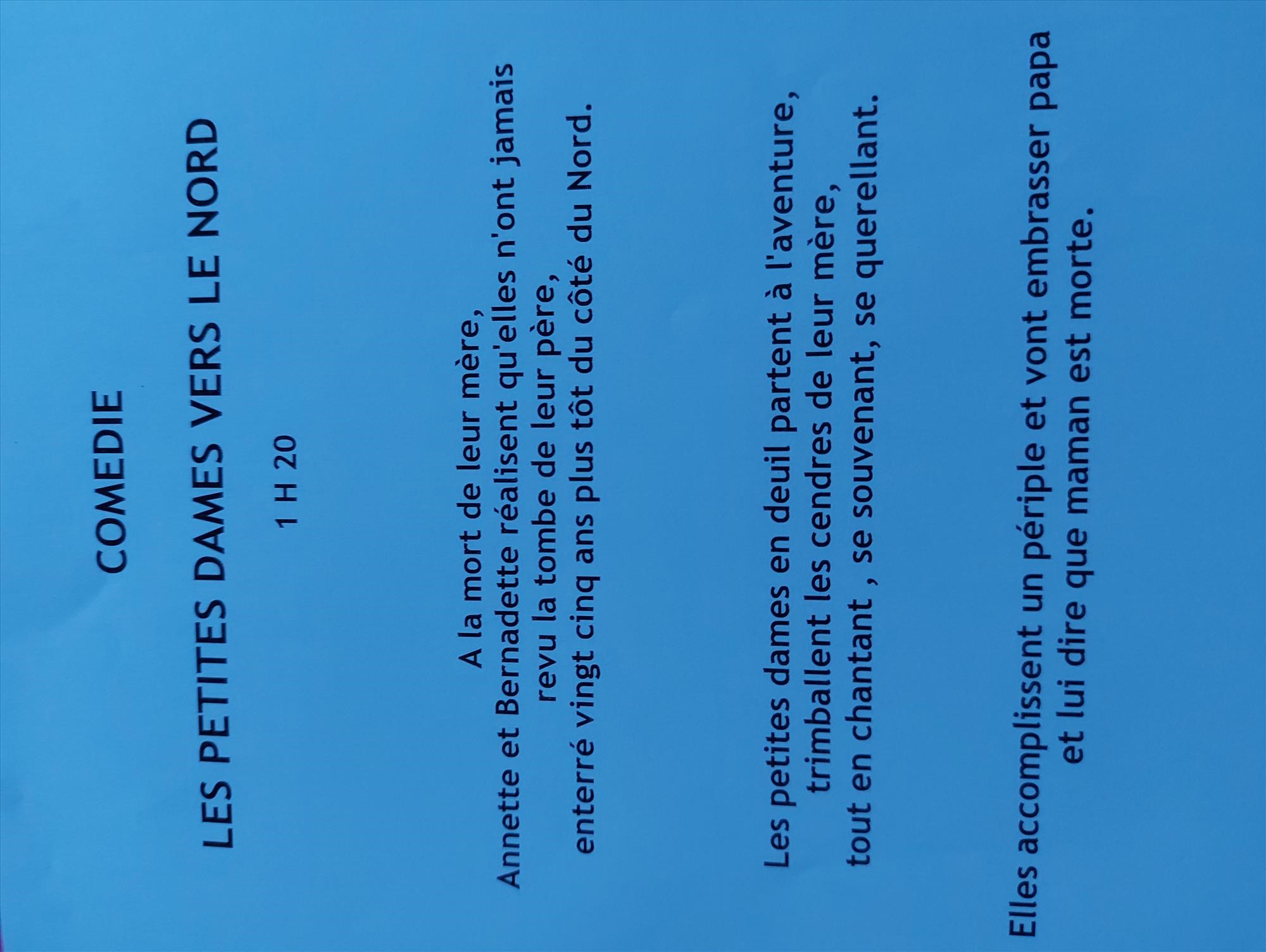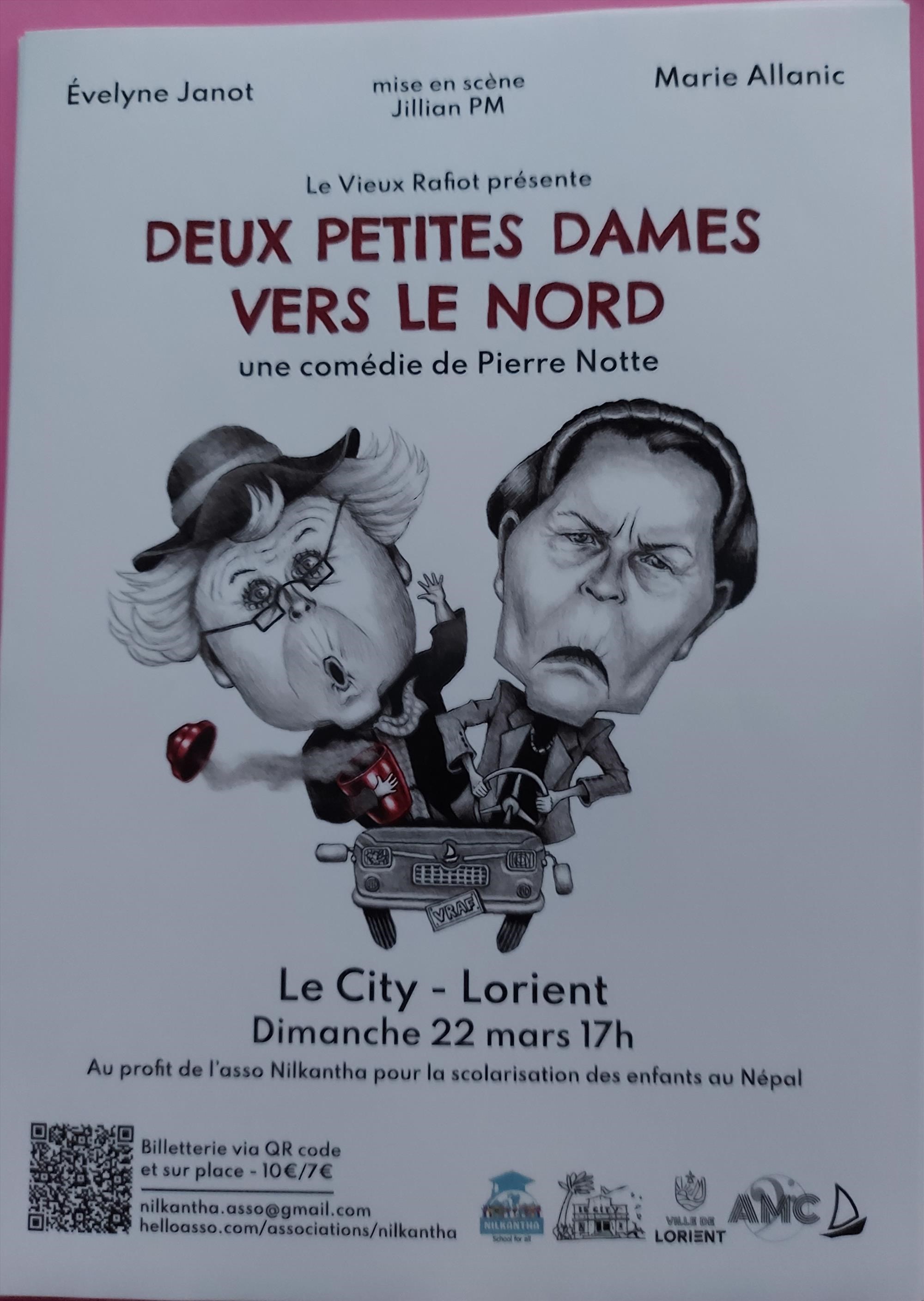 Théâtre « Deux petites dames vers le nord » de Pierre Notte. Dimanche 22 mars de 17 h à 18 h 20, Théâtre Le City, rue Roger-Salengro, Lorient. Tarif 10€, réduit 7€. Réservation avant le dimanche 22 mars. Contact : 07 68 13 56 73, nadine.faraud@gmail.com.