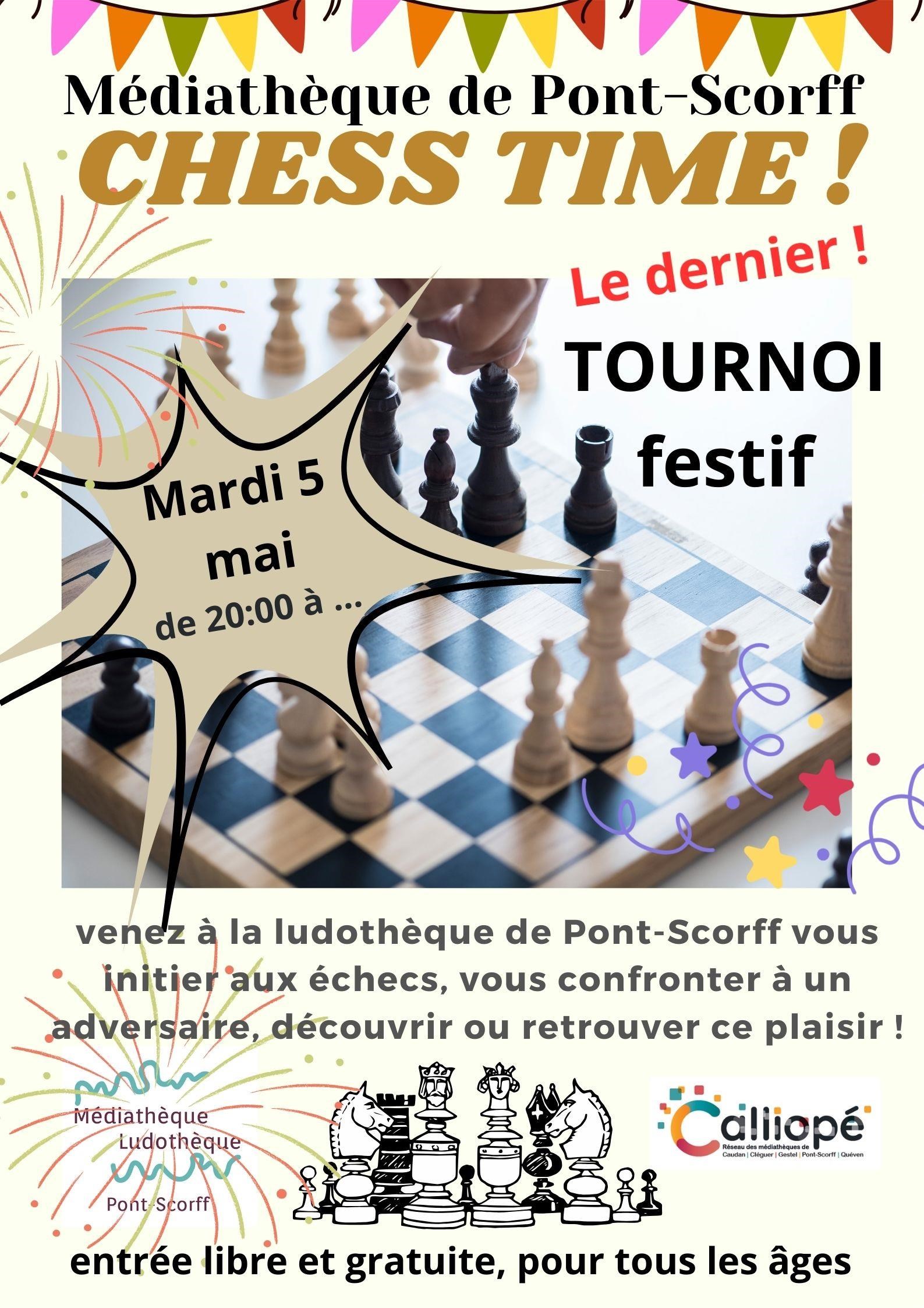 Tournoi d’échecs à la ludothèque, ouvert aux joueurs débutants ou confirmés. Entrée libre. Mardi 5 mai de 20 h à 22 h, médiathèque-ludothèque, 34, place de la Maison-des-Princes, Pont-Scorff. Gratuit. Contact : 02 56 54 06 44, mediatheque@pontscorff.bzh, http://calliope.bzh.