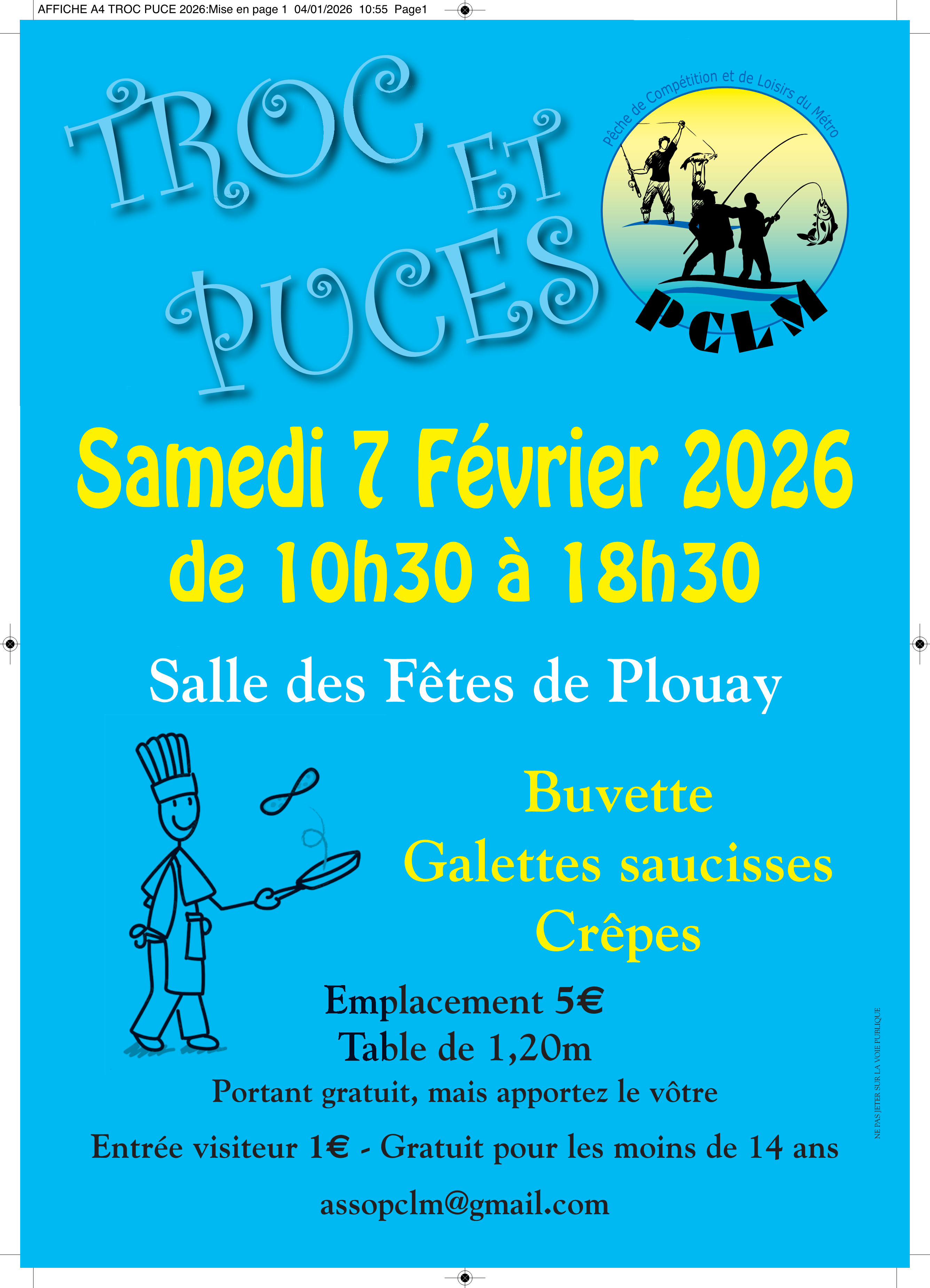 Troc et Puces : le samedi 7 février 2026 de 10h30 à 18h30 à la salle des Fêtes de Plouay. Buvette et restauration sur place, galettes saucisses et crêpes faites maison, sandwichs. Tombola. Entre 30 et 50 exposants. Entrée : 1€ à partir de 14 ans.