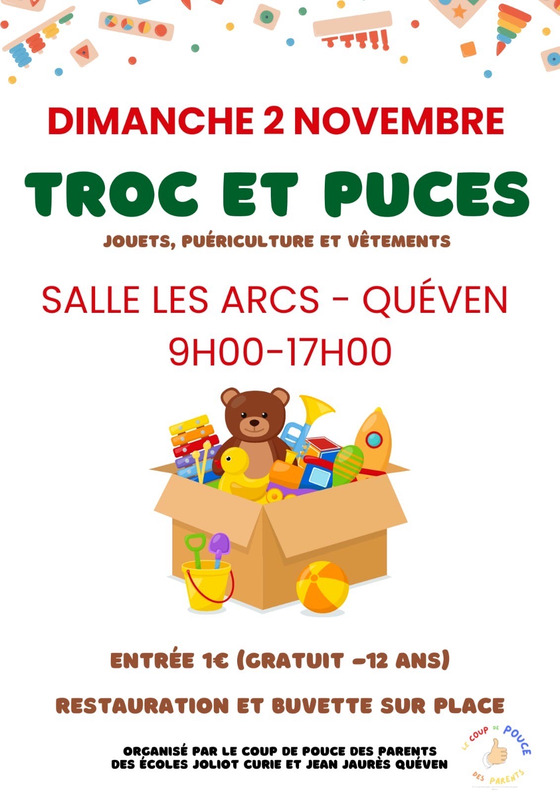 Troc et Puces jouets, puériculture et vêtements organisé par le Coup de Pouce des parents des écoles Joliot Curie et Jean Jaurès Quéven.