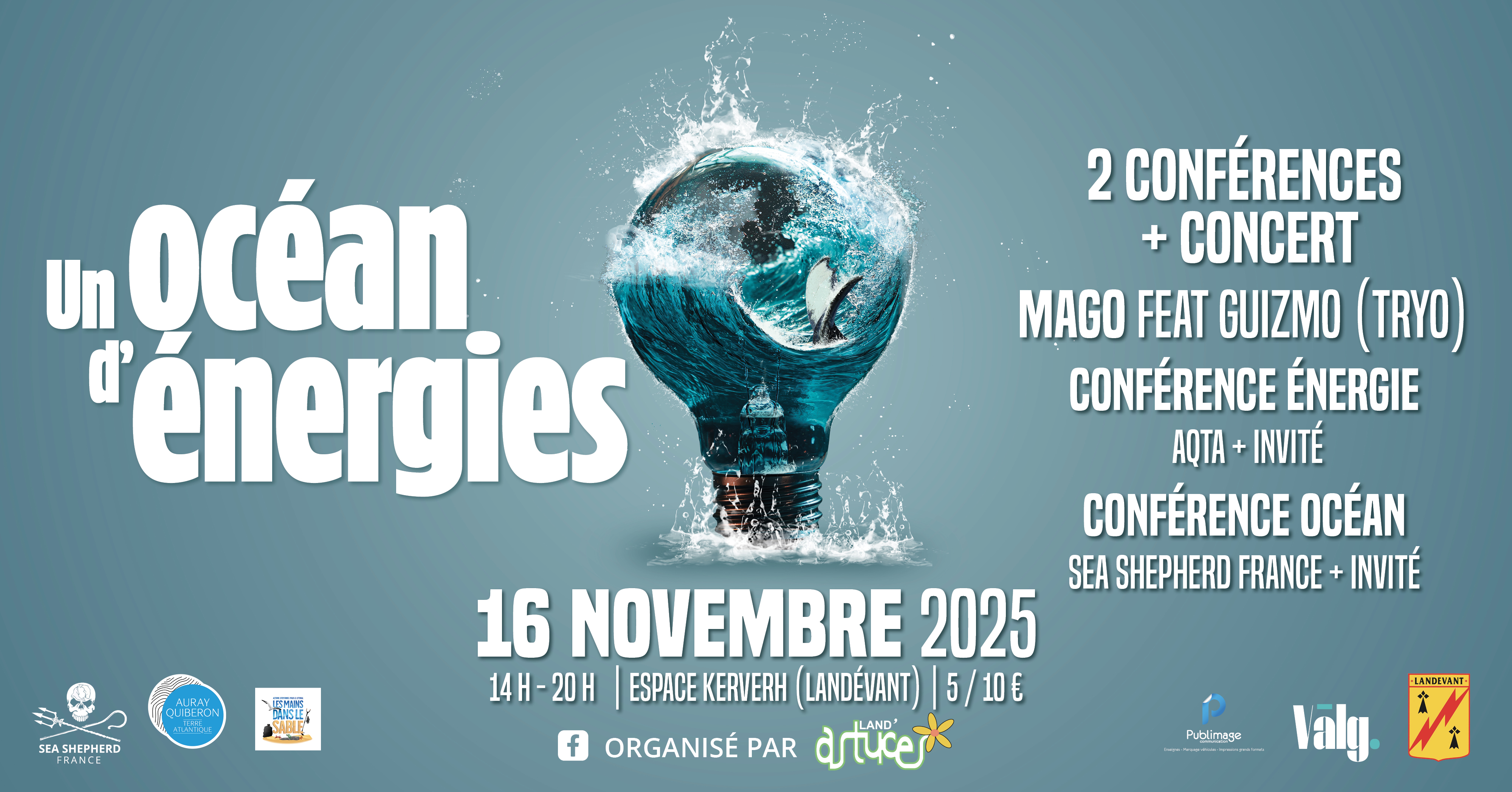 Votre association vous présente un nouveau projet qui lui tient à cœur.Un océan d’énergiesConférences et concertsLes bases sont toujours les mêmes : partage, écocitoyenneté, musique, accessibilité, intergénération.La date : le 16/11/2025Les horaires : 14 h à 20 hLe lieu : Espace Kerverh, Landevant (56)Les tarifs :Conférences seules : 5 eurosConcerts seuls : 5 eurosConférences + concerts : 10 eurosGratuit : moins de 12 ansLes billets : https://www.helloasso.com/…/evenements/un-ocean-d-energiesLe programme :14 h à 18 h : stands Sea Shepherd, AQTA et invités14 h 30 à 16 h : conférence AQTA et AutonomvieVisionnage, questions, réponses et débats sur les énergies (logement, renouvelable, approvisionnement, etc.)https://www.auray-quiberon.fr/https://autonomvie.org/16 h 30 à 18 h : conférence Sea Shepherd France et invitésVisionnage, questions, réponses et débats sur les océans (pollution, futur, enjeux, etc.)https://seashepherd.fr/18 h 30 à 20 h : concertsMAGO feat Guizmo (Tryo)https://magogroupe.fr/https://www.facebook.com/guiz.tryoFoods and drinks toute la journée.