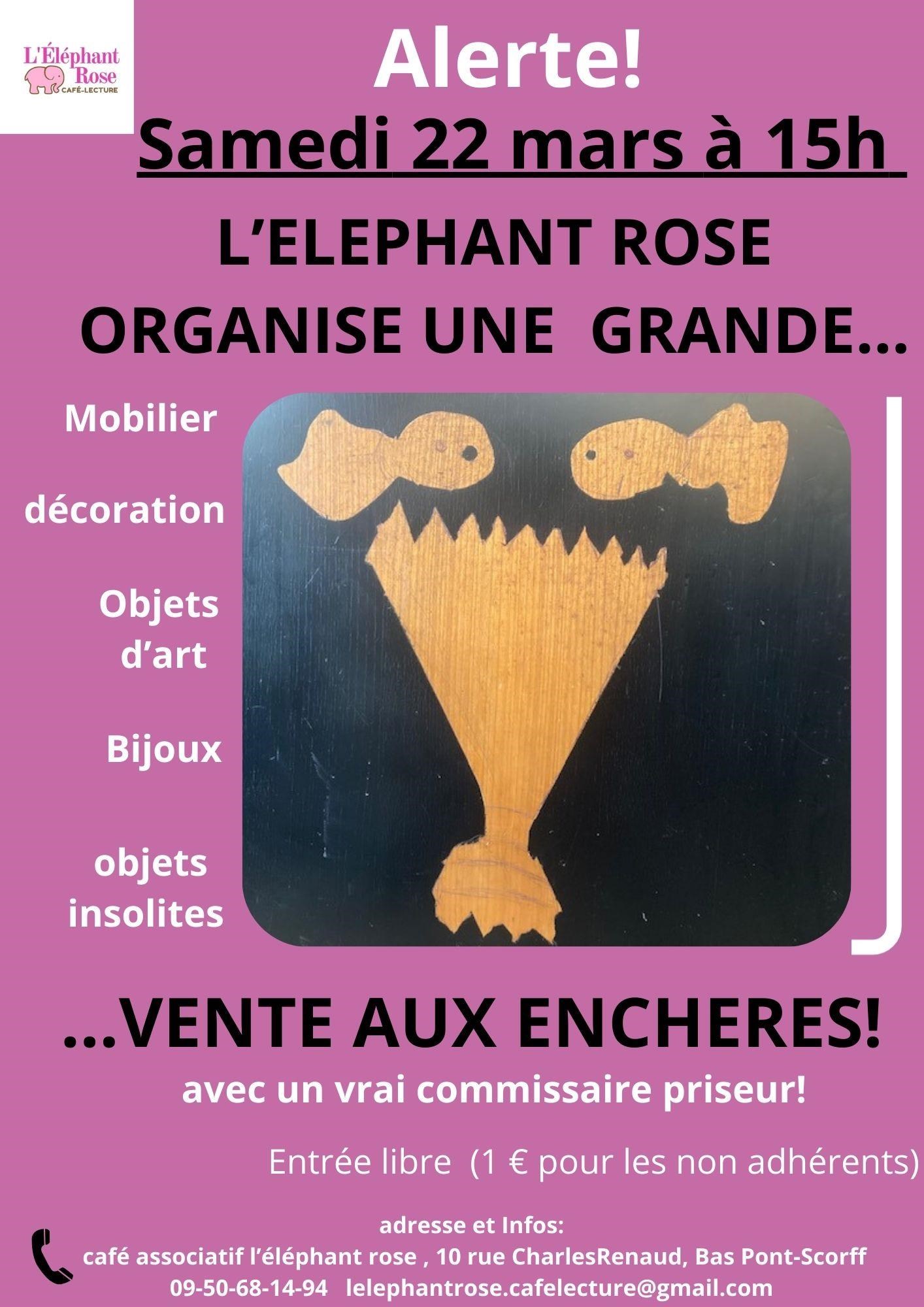 Pour s’amuser, l’éléphant rose organise une vente aux enchères insolite ce dimanche. Entrée gratuite ou à 1 € pour les non-adhérents à l’association. Dimanche 22 mars de 15 h à 19 h, Café associatif l’Éléphant rose Cléguer. Gratuit. Contact : 09 50 68 14 94, lelephantrose.cafelecture@gmail.com.